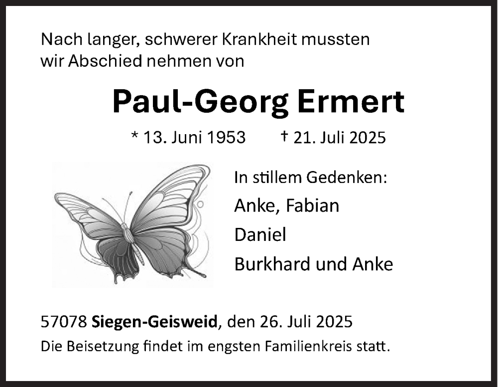 Hier finden Sie alle Traueranzeigen aus der Zeitung, die bisher für Paul-Georg Ermert erschienen sind. Weitere Traueranzeigen, die in der Zeitung erscheinen, werden hier ebenfalls aufgelistet