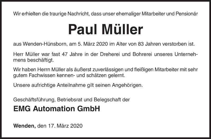 Hier finden Sie alle Traueranzeigen aus der Zeitung, die bisher für Paul Müller erschienen sind. Weitere Traueranzeigen, die in der Zeitung erscheinen, werden hier ebenfalls aufgelistet