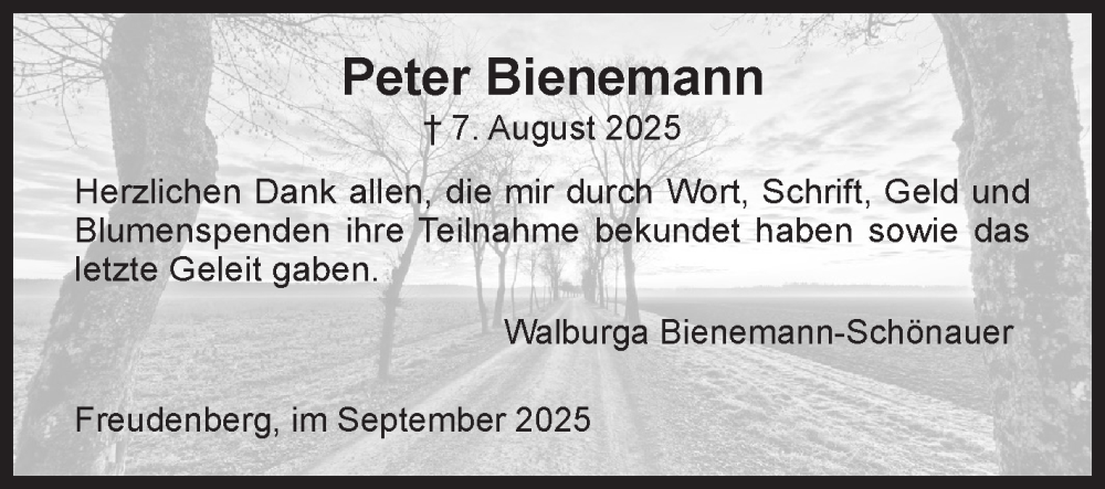 Hier finden Sie alle Traueranzeigen aus der Zeitung, die bisher für Peter Bienemann erschienen sind. Weitere Traueranzeigen, die in der Zeitung erscheinen, werden hier ebenfalls aufgelistet