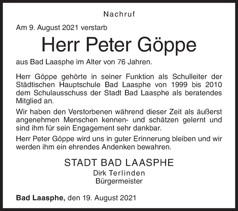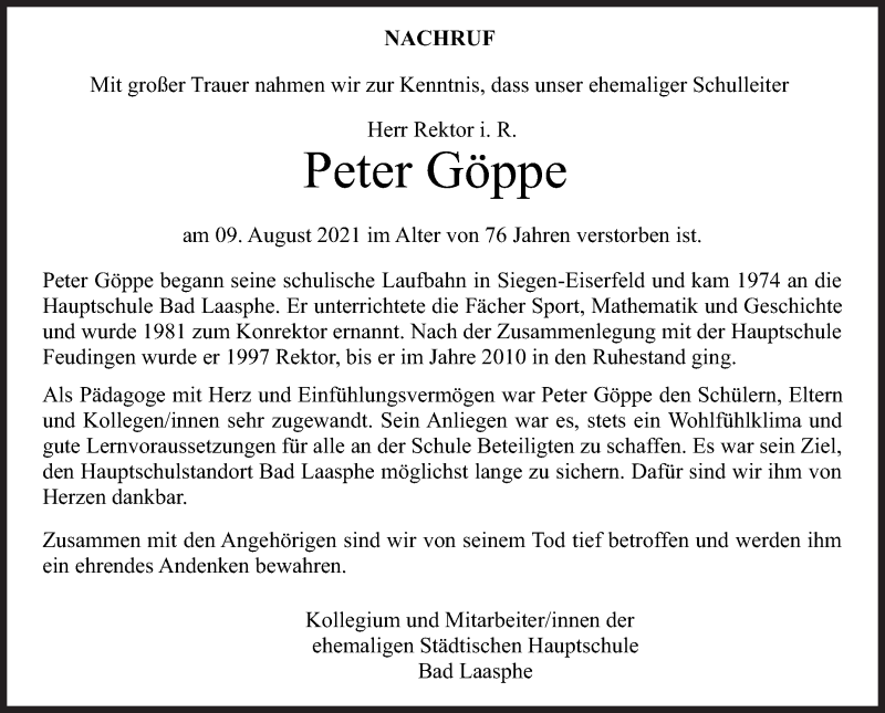 Hier finden Sie alle Traueranzeigen aus der Zeitung, die bisher für Peter Göppe erschienen sind. Weitere Traueranzeigen, die in der Zeitung erscheinen, werden hier ebenfalls aufgelistet