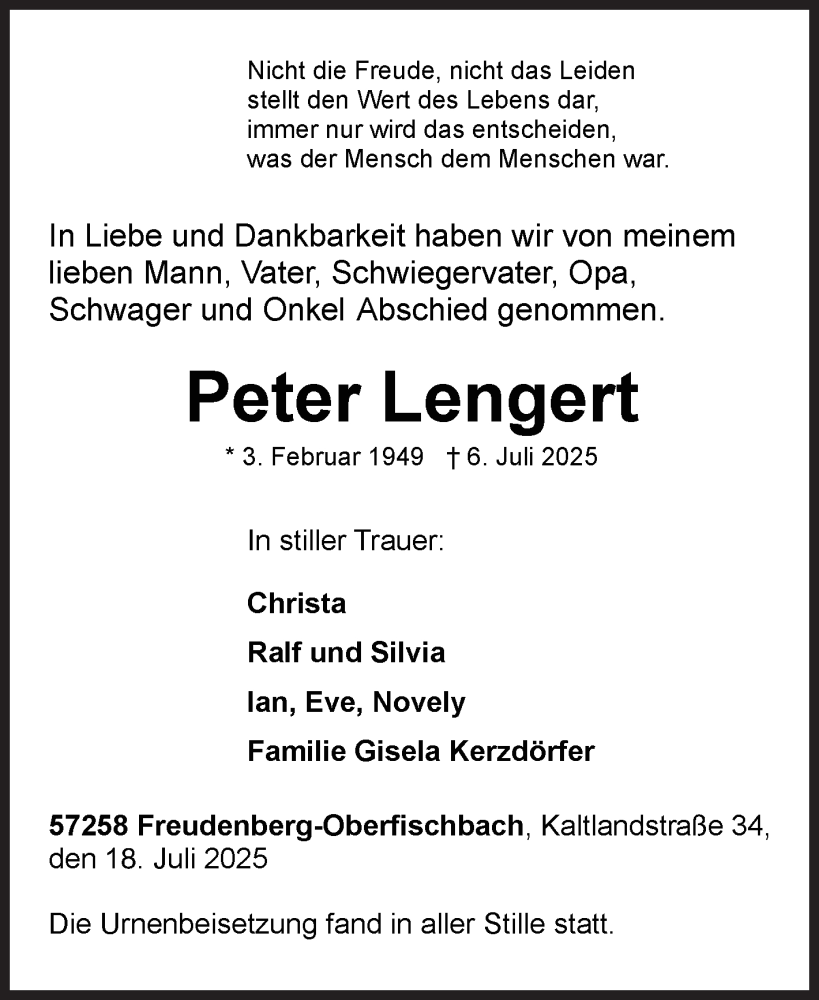 Hier finden Sie alle Traueranzeigen aus der Zeitung, die bisher für Peter Lengert erschienen sind. Weitere Traueranzeigen, die in der Zeitung erscheinen, werden hier ebenfalls aufgelistet