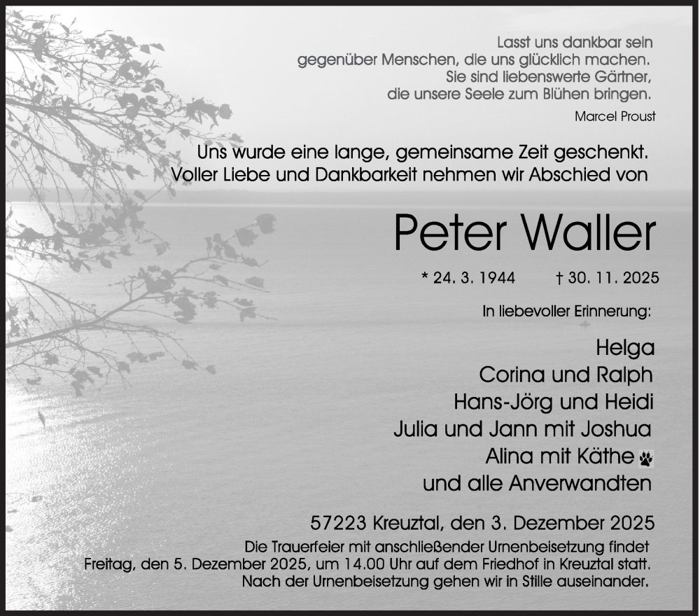 Hier finden Sie alle Traueranzeigen aus der Zeitung, die bisher für Peter Waller erschienen sind. Weitere Traueranzeigen, die in der Zeitung erscheinen, werden hier ebenfalls aufgelistet