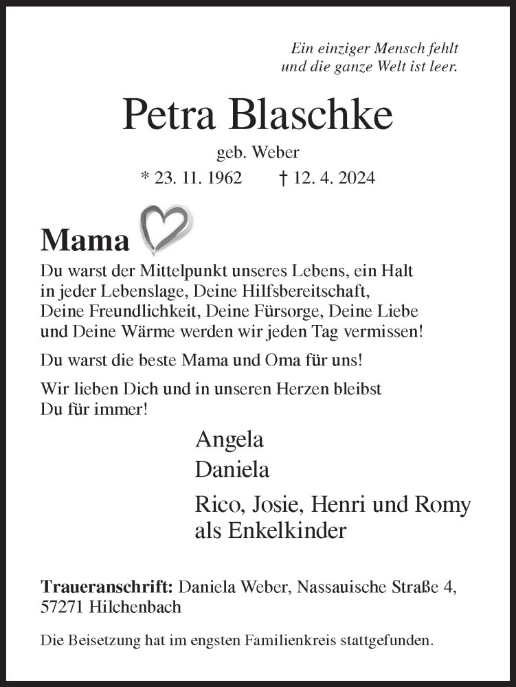 Hier finden Sie alle Traueranzeigen aus der Zeitung, die bisher für Petra Blaschke erschienen sind. Weitere Traueranzeigen, die in der Zeitung erscheinen, werden hier ebenfalls aufgelistet