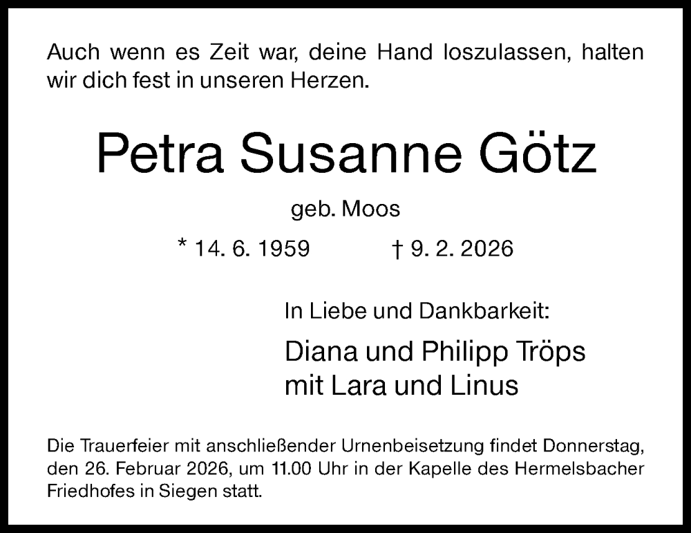 Hier finden Sie alle Traueranzeigen aus der Zeitung, die bisher für Petra Susanne Götz erschienen sind. Weitere Traueranzeigen, die in der Zeitung erscheinen, werden hier ebenfalls aufgelistet