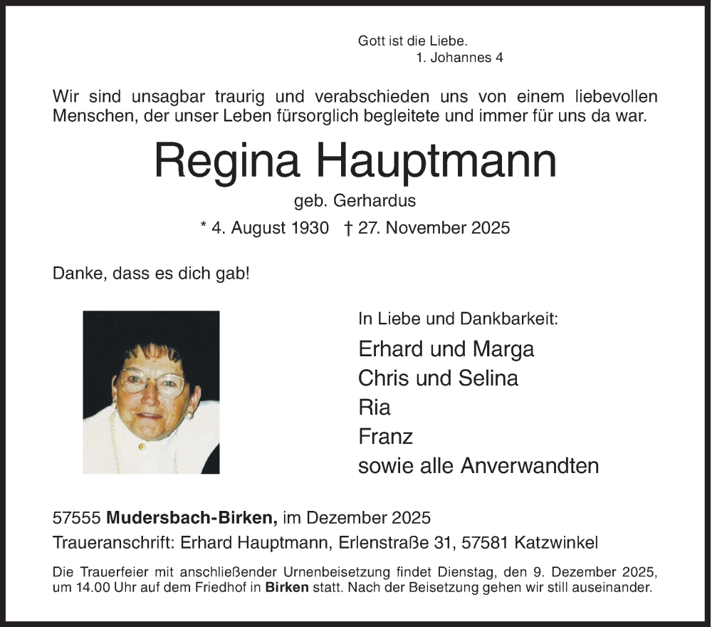 Hier finden Sie alle Traueranzeigen aus der Zeitung, die bisher für Regina Hauptmann erschienen sind. Weitere Traueranzeigen, die in der Zeitung erscheinen, werden hier ebenfalls aufgelistet