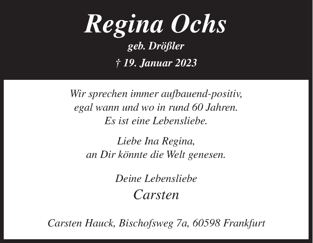 Hier finden Sie alle Traueranzeigen aus der Zeitung, die bisher für Regina Ochs erschienen sind. Weitere Traueranzeigen, die in der Zeitung erscheinen, werden hier ebenfalls aufgelistet