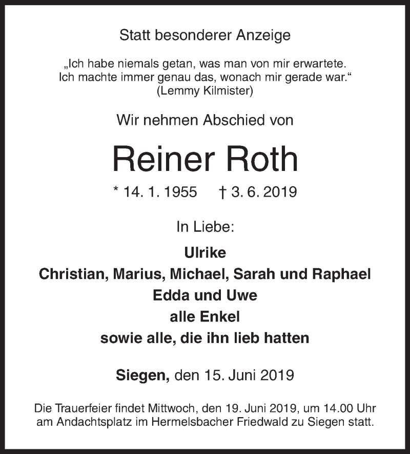 Hier finden Sie alle Traueranzeigen aus der Zeitung, die bisher für Reiner Roth erschienen sind. Weitere Traueranzeigen, die in der Zeitung erscheinen, werden hier ebenfalls aufgelistet