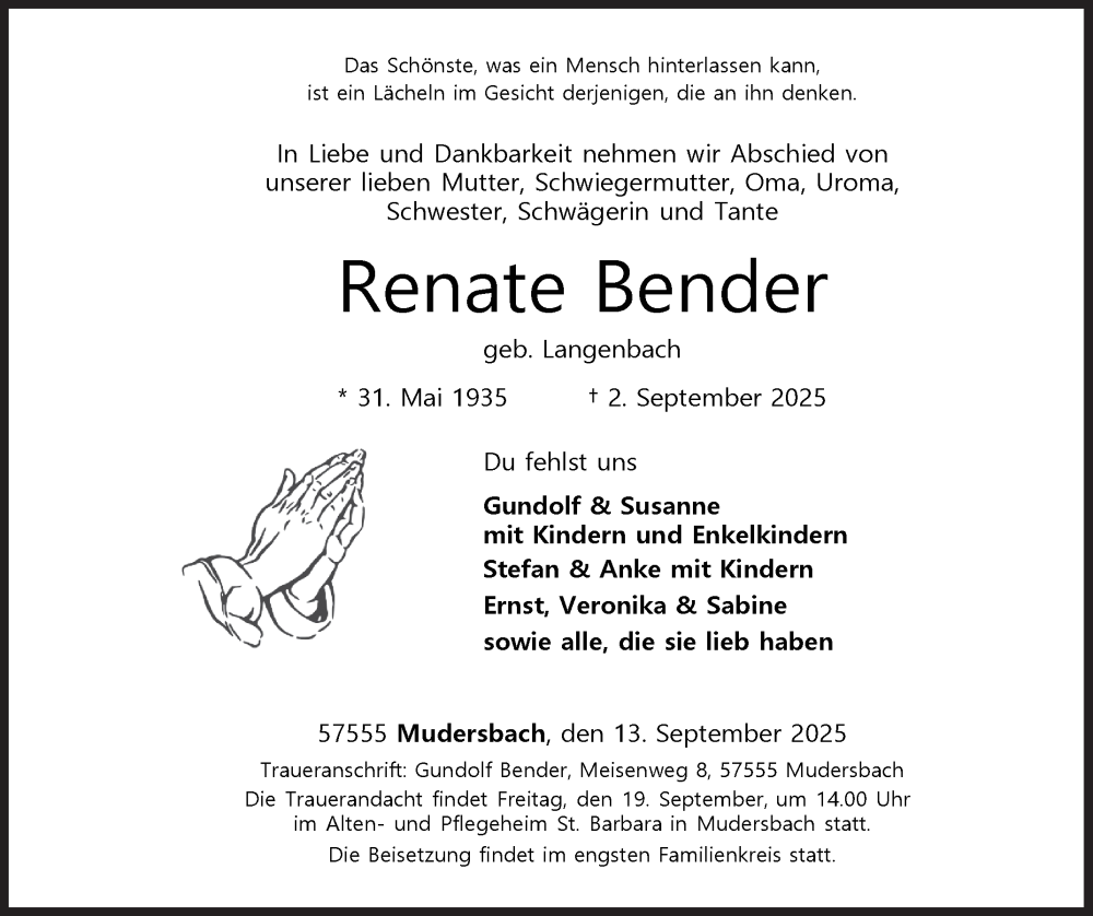 Hier finden Sie alle Traueranzeigen aus der Zeitung, die bisher für Renate Bender erschienen sind. Weitere Traueranzeigen, die in der Zeitung erscheinen, werden hier ebenfalls aufgelistet