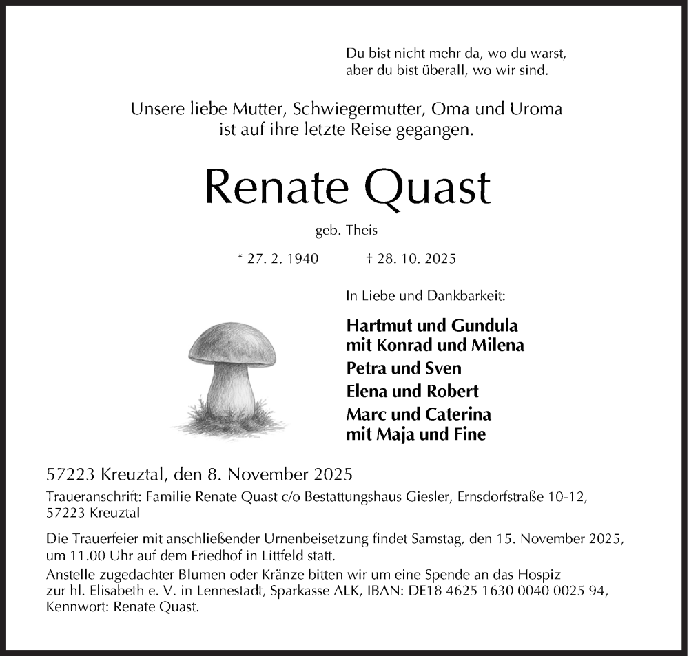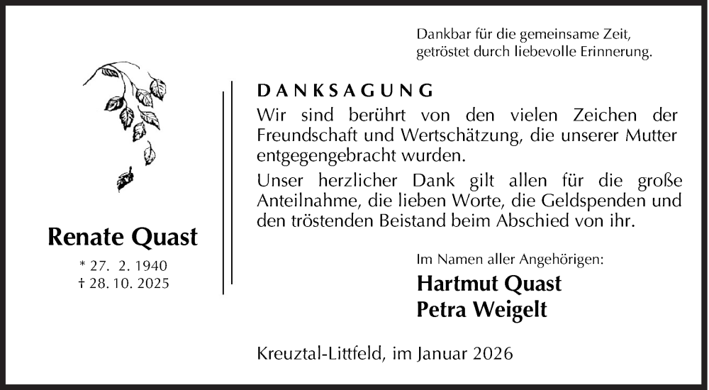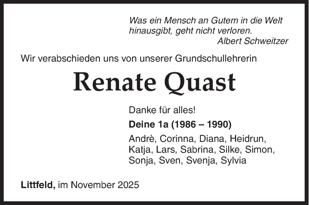 Hier finden Sie alle Traueranzeigen aus der Zeitung, die bisher für Renate Quast erschienen sind. Weitere Traueranzeigen, die in der Zeitung erscheinen, werden hier ebenfalls aufgelistet