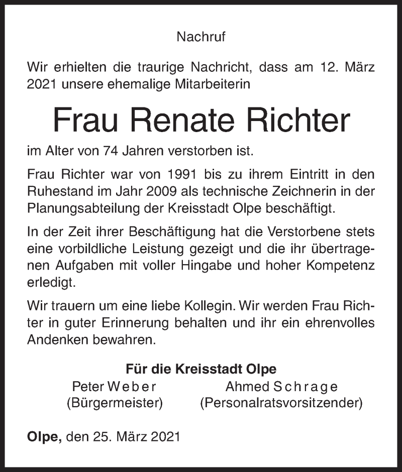 Hier finden Sie alle Traueranzeigen aus der Zeitung, die bisher für Renate Richter erschienen sind. Weitere Traueranzeigen, die in der Zeitung erscheinen, werden hier ebenfalls aufgelistet