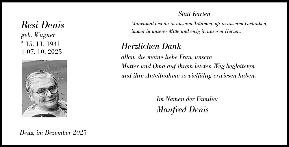 Hier finden Sie alle Traueranzeigen aus der Zeitung, die bisher für Resi Denis erschienen sind. Weitere Traueranzeigen, die in der Zeitung erscheinen, werden hier ebenfalls aufgelistet