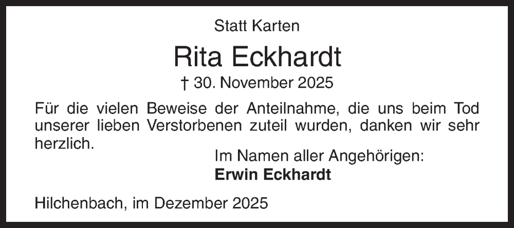 Hier finden Sie alle Traueranzeigen aus der Zeitung, die bisher für Rita Eckhardt erschienen sind. Weitere Traueranzeigen, die in der Zeitung erscheinen, werden hier ebenfalls aufgelistet