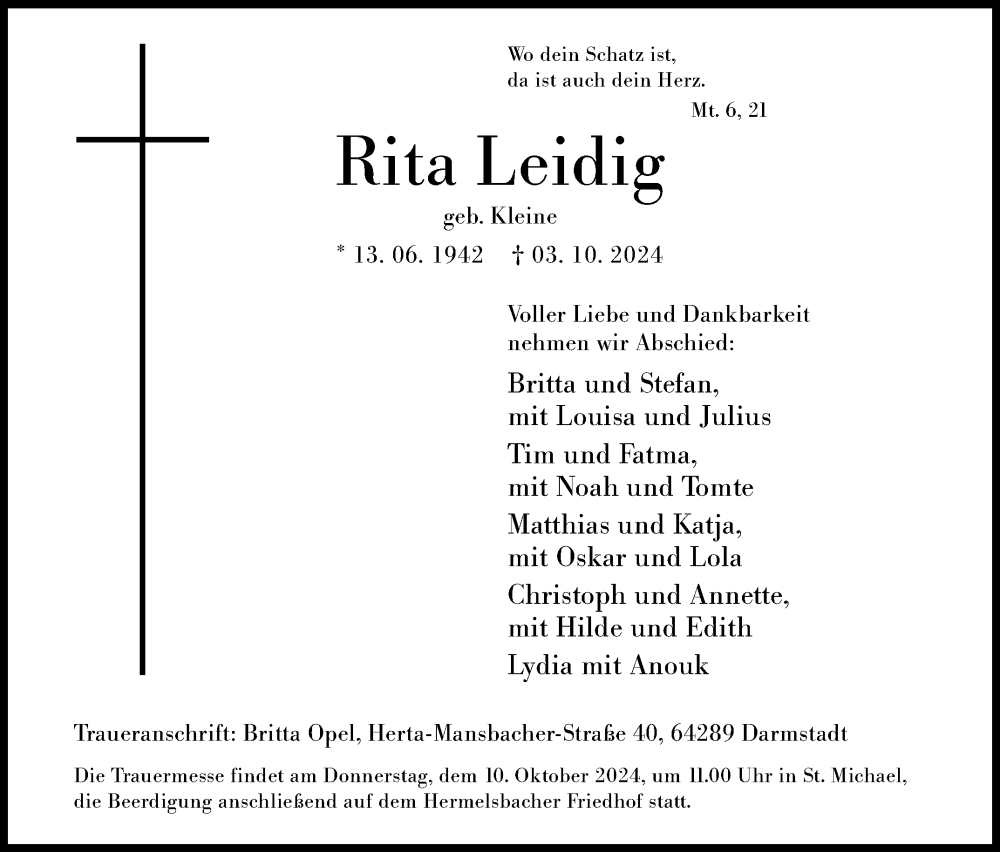 Hier finden Sie alle Traueranzeigen aus der Zeitung, die bisher für Rita Leidig erschienen sind. Weitere Traueranzeigen, die in der Zeitung erscheinen, werden hier ebenfalls aufgelistet