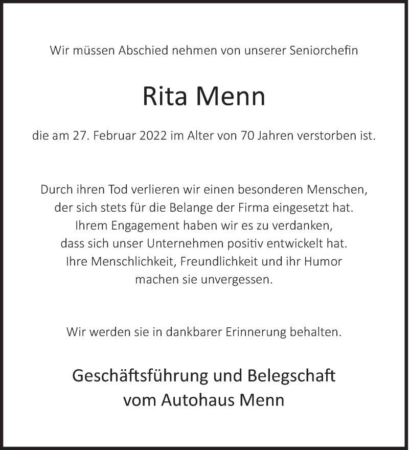 Hier finden Sie alle Traueranzeigen aus der Zeitung, die bisher für Rita Menn erschienen sind. Weitere Traueranzeigen, die in der Zeitung erscheinen, werden hier ebenfalls aufgelistet