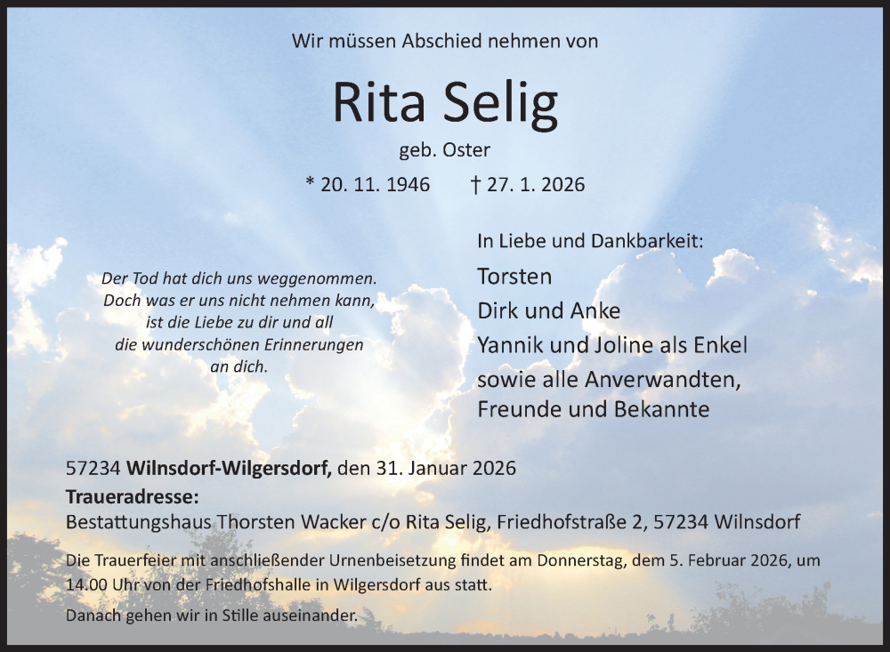 Hier finden Sie alle Traueranzeigen aus der Zeitung, die bisher für Rita Selig erschienen sind. Weitere Traueranzeigen, die in der Zeitung erscheinen, werden hier ebenfalls aufgelistet