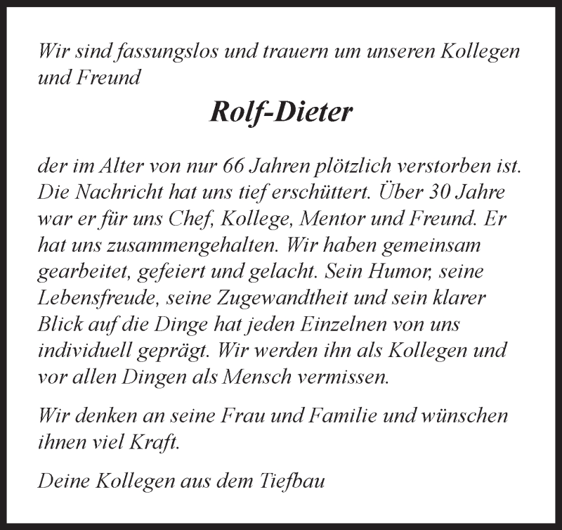 Hier finden Sie alle Traueranzeigen aus der Zeitung, die bisher für Rolf-Dieter erschienen sind. Weitere Traueranzeigen, die in der Zeitung erscheinen, werden hier ebenfalls aufgelistet