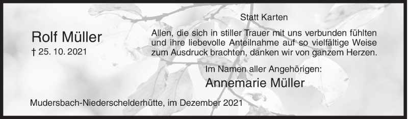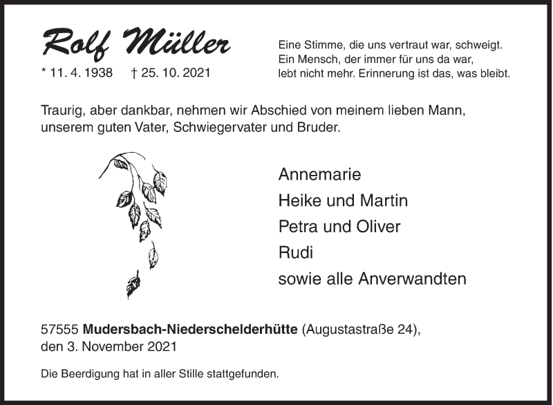 Hier finden Sie alle Traueranzeigen aus der Zeitung, die bisher für Rolf Müller erschienen sind. Weitere Traueranzeigen, die in der Zeitung erscheinen, werden hier ebenfalls aufgelistet