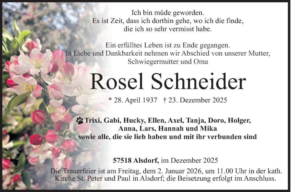 Hier finden Sie alle Traueranzeigen aus der Zeitung, die bisher für Rosel Schneider erschienen sind. Weitere Traueranzeigen, die in der Zeitung erscheinen, werden hier ebenfalls aufgelistet