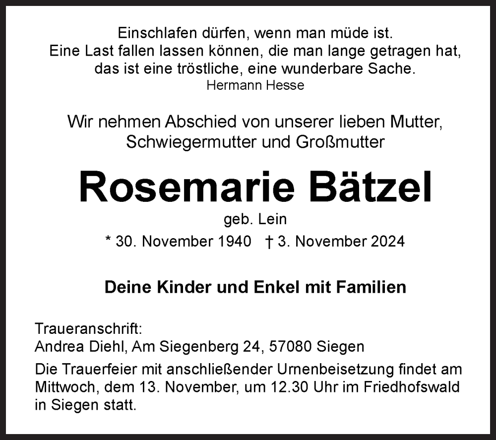 Hier finden Sie alle Traueranzeigen aus der Zeitung, die bisher für Rosemarie Bätzel erschienen sind. Weitere Traueranzeigen, die in der Zeitung erscheinen, werden hier ebenfalls aufgelistet