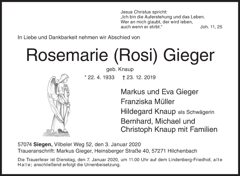 Hier finden Sie alle Traueranzeigen aus der Zeitung, die bisher für Rosemarie Gieger erschienen sind. Weitere Traueranzeigen, die in der Zeitung erscheinen, werden hier ebenfalls aufgelistet
