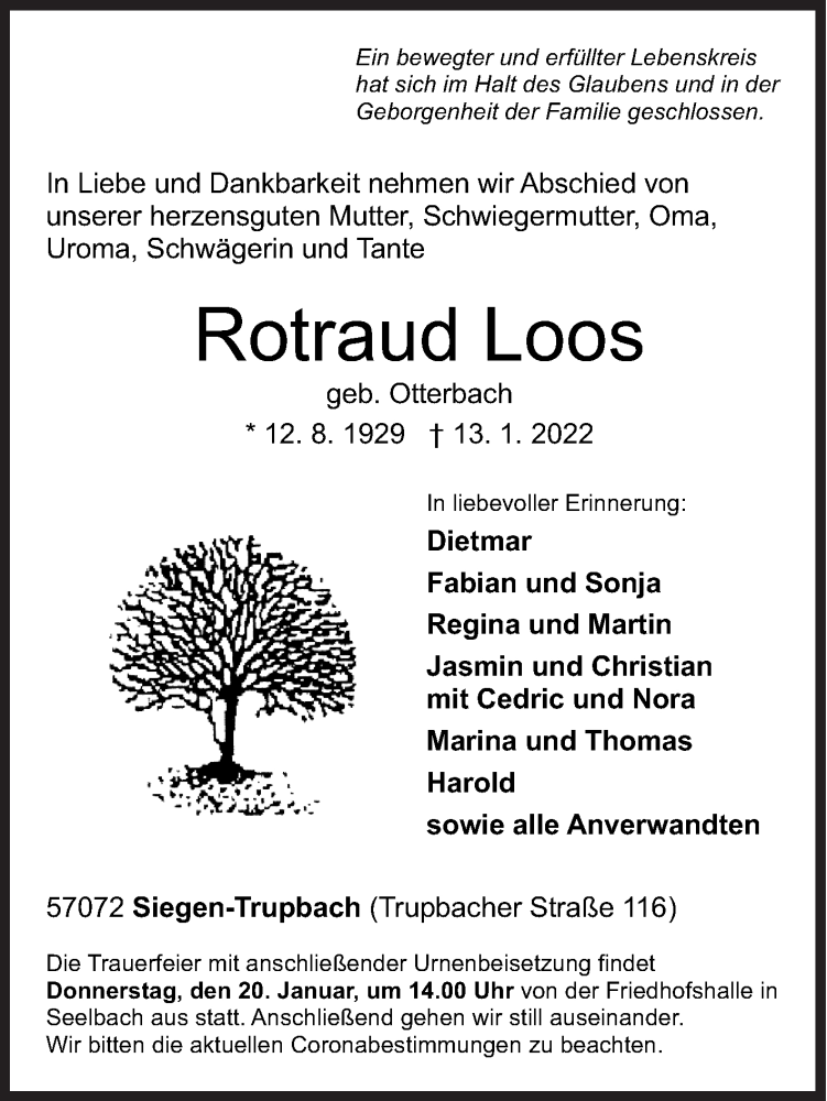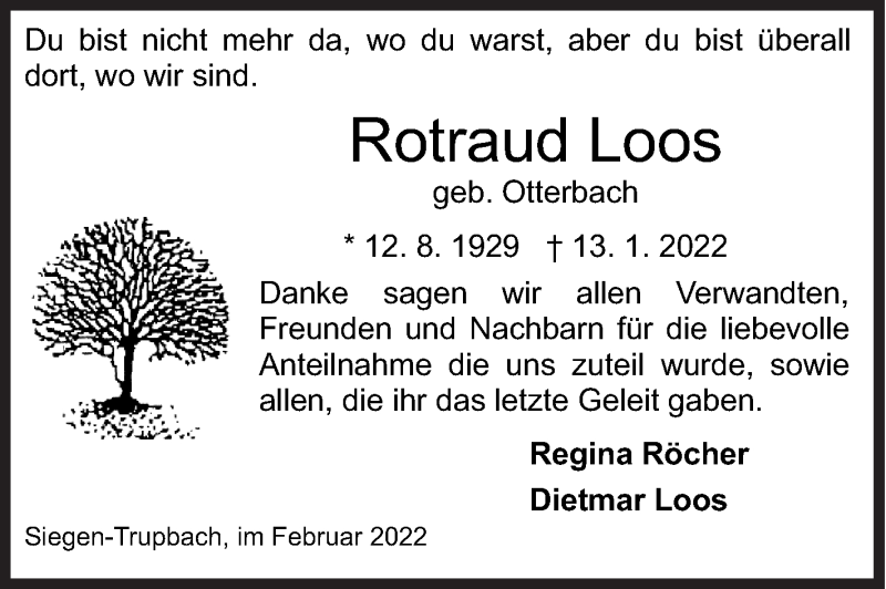 Hier finden Sie alle Traueranzeigen aus der Zeitung, die bisher für Rotraud Loos erschienen sind. Weitere Traueranzeigen, die in der Zeitung erscheinen, werden hier ebenfalls aufgelistet