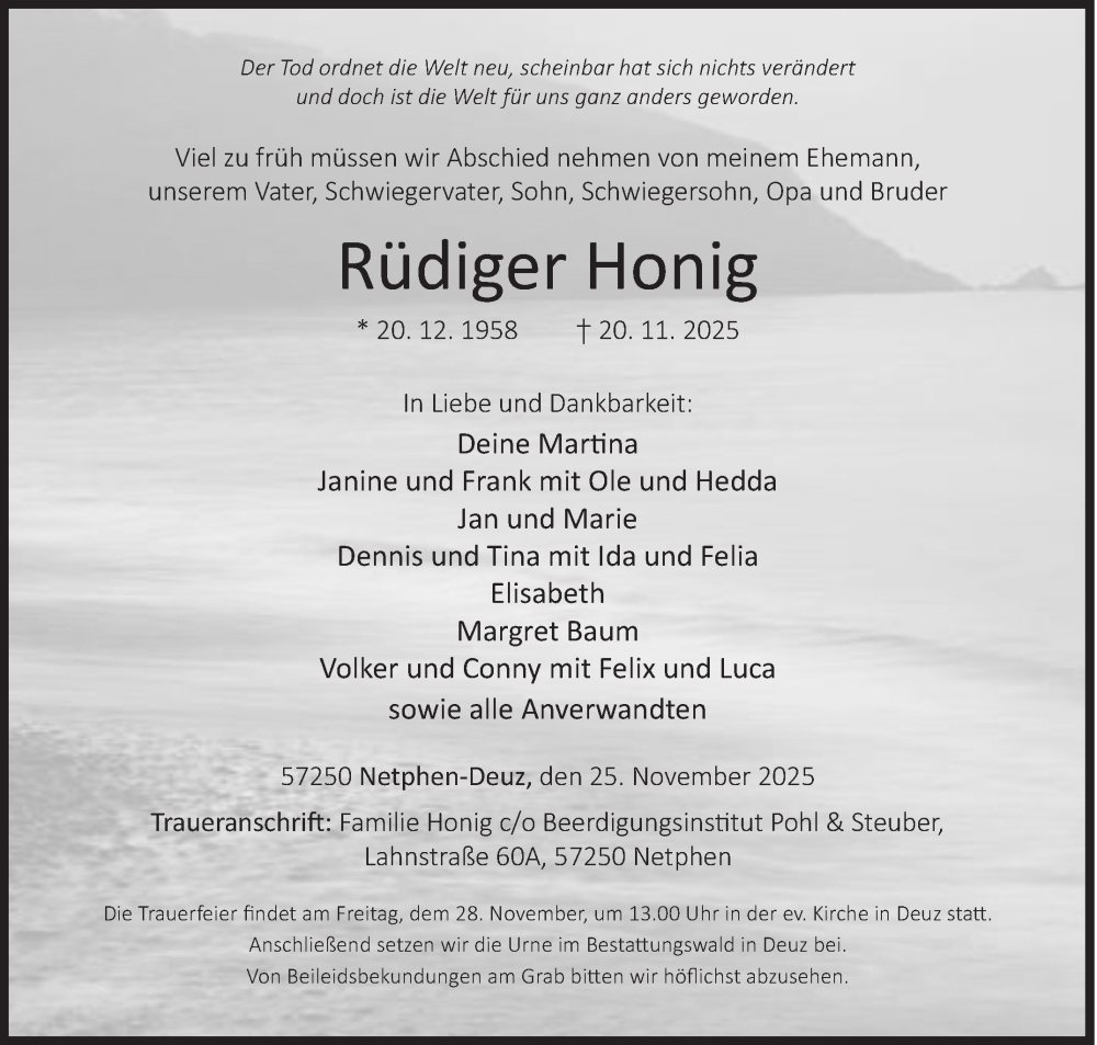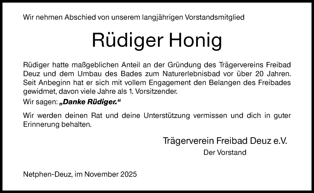 Hier finden Sie alle Traueranzeigen aus der Zeitung, die bisher für Rüdiger Honig erschienen sind. Weitere Traueranzeigen, die in der Zeitung erscheinen, werden hier ebenfalls aufgelistet
