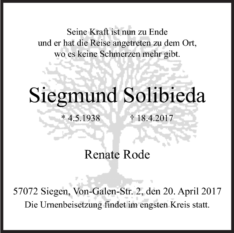 Hier finden Sie alle Traueranzeigen aus der Zeitung, die bisher für Siegmund Solibieda erschienen sind. Weitere Traueranzeigen, die in der Zeitung erscheinen, werden hier ebenfalls aufgelistet