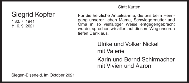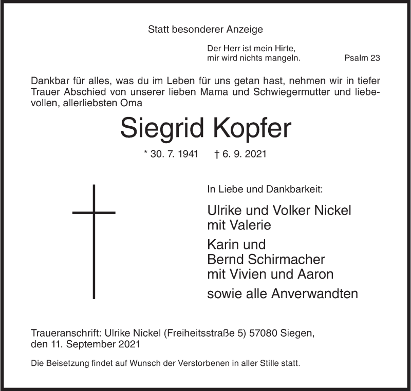 Hier finden Sie alle Traueranzeigen aus der Zeitung, die bisher für Siegrid Kopfer erschienen sind. Weitere Traueranzeigen, die in der Zeitung erscheinen, werden hier ebenfalls aufgelistet