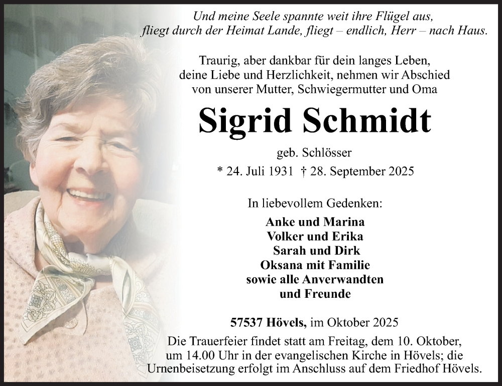 Hier finden Sie alle Traueranzeigen aus der Zeitung, die bisher für Sigrid Schmidt erschienen sind. Weitere Traueranzeigen, die in der Zeitung erscheinen, werden hier ebenfalls aufgelistet