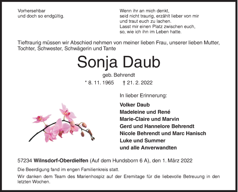 Hier finden Sie alle Traueranzeigen aus der Zeitung, die bisher für Sonja Daub erschienen sind. Weitere Traueranzeigen, die in der Zeitung erscheinen, werden hier ebenfalls aufgelistet