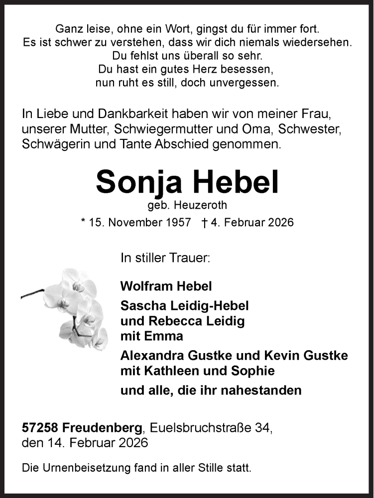 Hier finden Sie alle Traueranzeigen aus der Zeitung, die bisher für Sonja Hebel erschienen sind. Weitere Traueranzeigen, die in der Zeitung erscheinen, werden hier ebenfalls aufgelistet