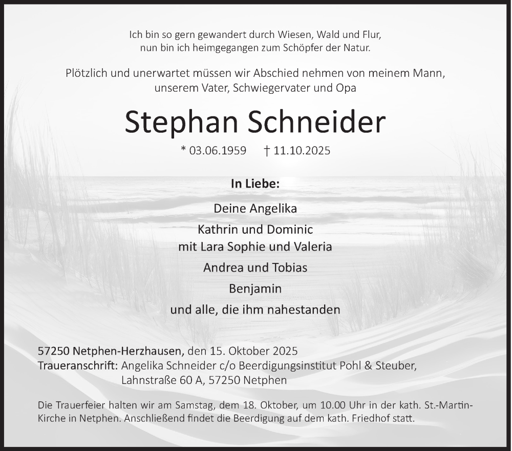Hier finden Sie alle Traueranzeigen aus der Zeitung, die bisher für Stephan Schneider erschienen sind. Weitere Traueranzeigen, die in der Zeitung erscheinen, werden hier ebenfalls aufgelistet