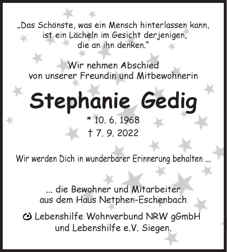 Hier finden Sie alle Traueranzeigen aus der Zeitung, die bisher für Stephanie Gedig erschienen sind. Weitere Traueranzeigen, die in der Zeitung erscheinen, werden hier ebenfalls aufgelistet