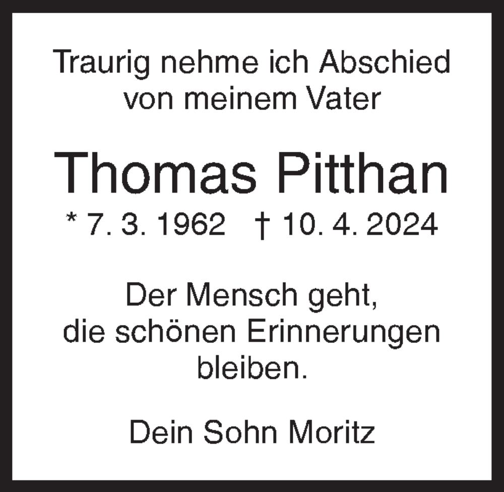 Hier finden Sie alle Traueranzeigen aus der Zeitung, die bisher für Thomas Pitthan erschienen sind. Weitere Traueranzeigen, die in der Zeitung erscheinen, werden hier ebenfalls aufgelistet