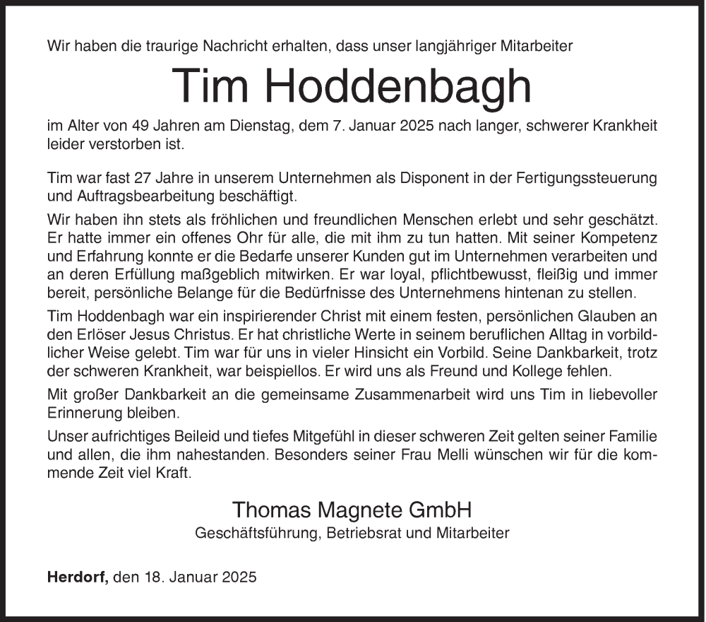 Hier finden Sie alle Traueranzeigen aus der Zeitung, die bisher für Tim Hoddenbagh erschienen sind. Weitere Traueranzeigen, die in der Zeitung erscheinen, werden hier ebenfalls aufgelistet