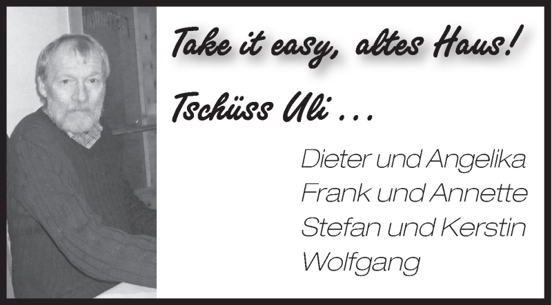 Hier finden Sie alle Traueranzeigen aus der Zeitung, die bisher für Uli erschienen sind. Weitere Traueranzeigen, die in der Zeitung erscheinen, werden hier ebenfalls aufgelistet