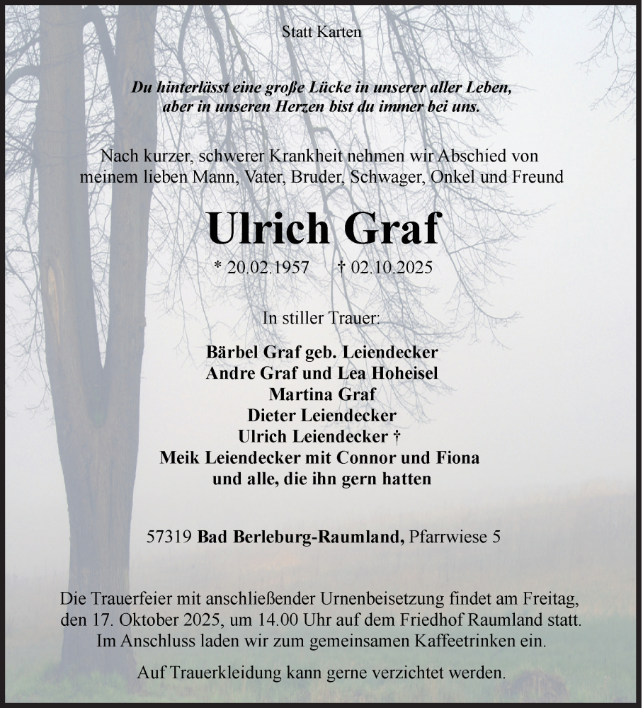 Hier finden Sie alle Traueranzeigen aus der Zeitung, die bisher für Ulrich Graf erschienen sind. Weitere Traueranzeigen, die in der Zeitung erscheinen, werden hier ebenfalls aufgelistet