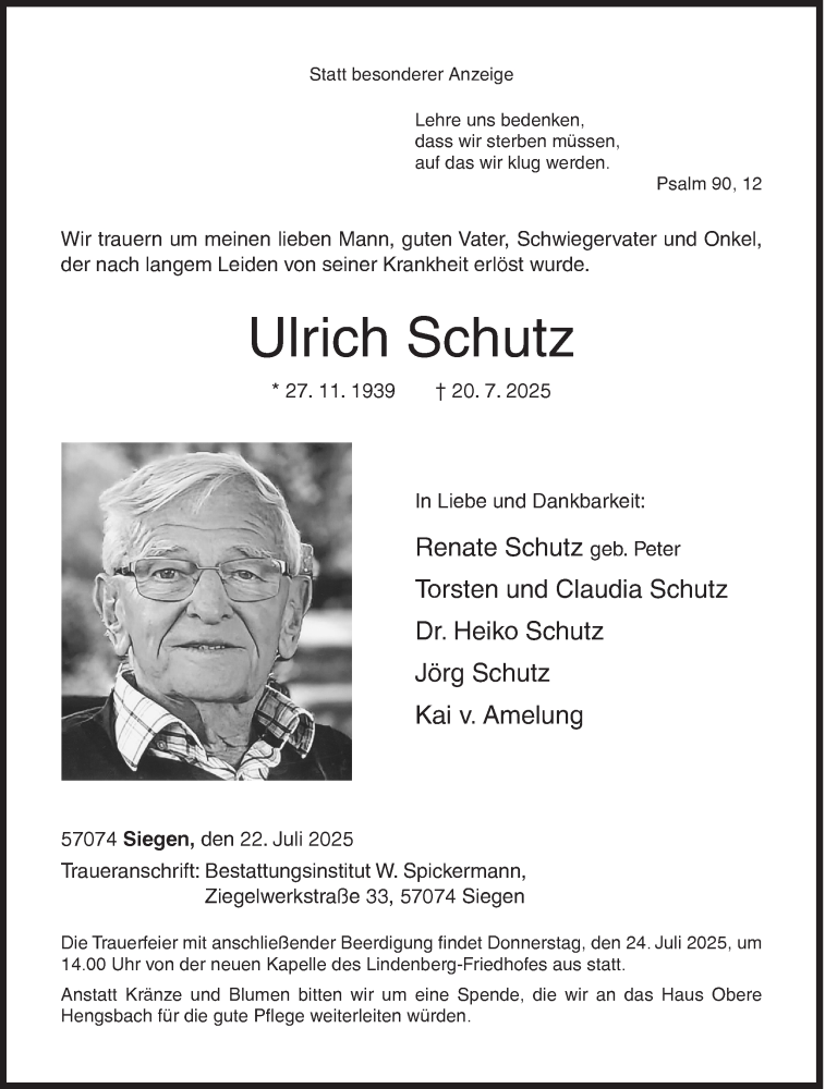 Hier finden Sie alle Traueranzeigen aus der Zeitung, die bisher für Ulrich Schutz erschienen sind. Weitere Traueranzeigen, die in der Zeitung erscheinen, werden hier ebenfalls aufgelistet