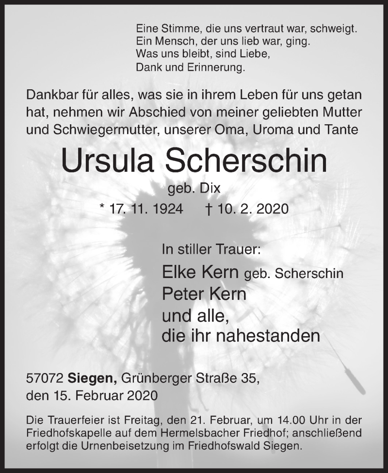Hier finden Sie alle Traueranzeigen aus der Zeitung, die bisher für Ursula Scherschin erschienen sind. Weitere Traueranzeigen, die in der Zeitung erscheinen, werden hier ebenfalls aufgelistet