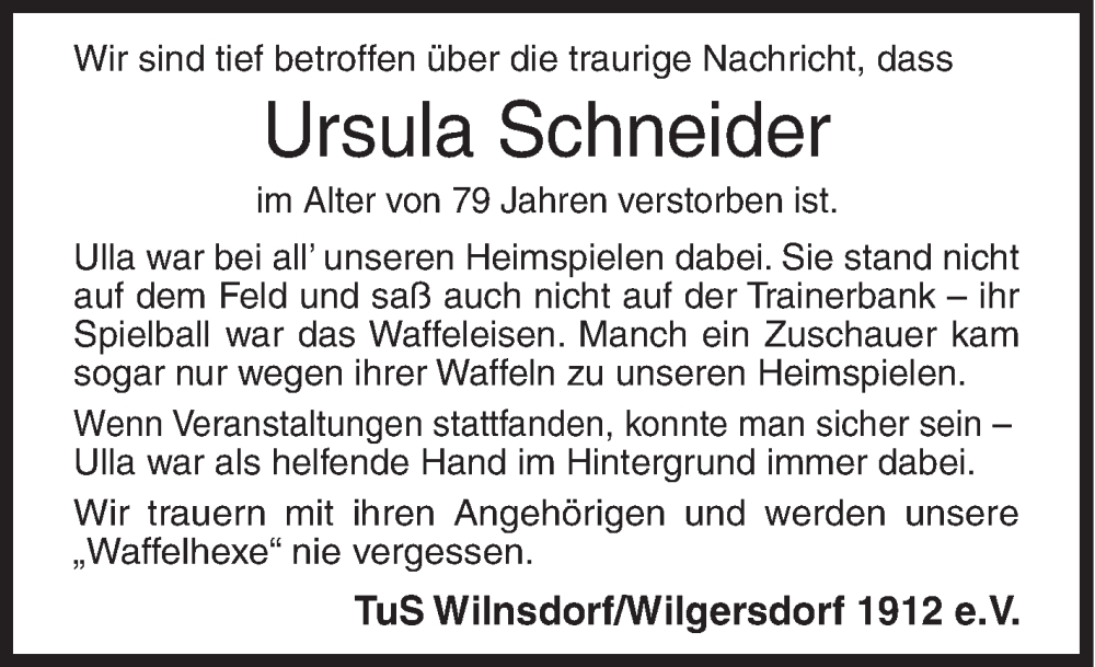 Hier finden Sie alle Traueranzeigen aus der Zeitung, die bisher für Ursula Schneider erschienen sind. Weitere Traueranzeigen, die in der Zeitung erscheinen, werden hier ebenfalls aufgelistet
