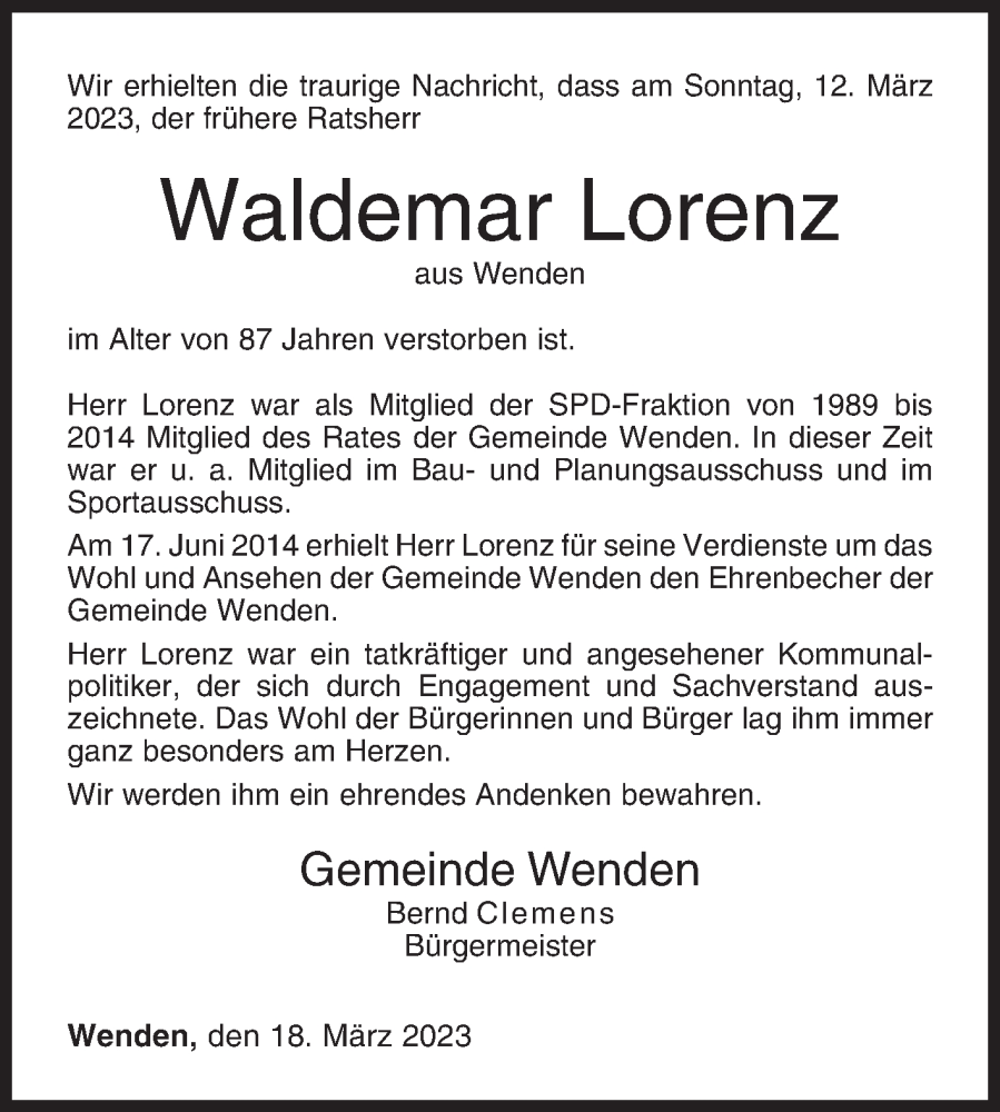 Hier finden Sie alle Traueranzeigen aus der Zeitung, die bisher für Waldemar Lorenz erschienen sind. Weitere Traueranzeigen, die in der Zeitung erscheinen, werden hier ebenfalls aufgelistet