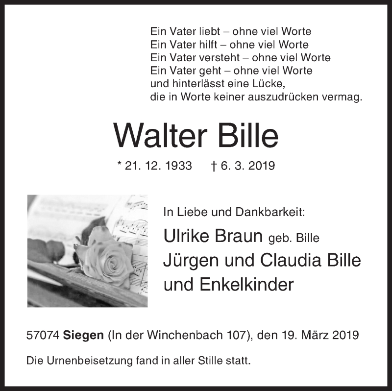 Hier finden Sie alle Traueranzeigen aus der Zeitung, die bisher für Walter Bille erschienen sind. Weitere Traueranzeigen, die in der Zeitung erscheinen, werden hier ebenfalls aufgelistet
