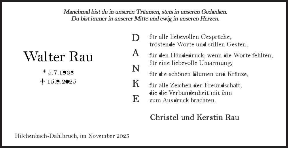 Hier finden Sie alle Traueranzeigen aus der Zeitung, die bisher für Walter Rau erschienen sind. Weitere Traueranzeigen, die in der Zeitung erscheinen, werden hier ebenfalls aufgelistet