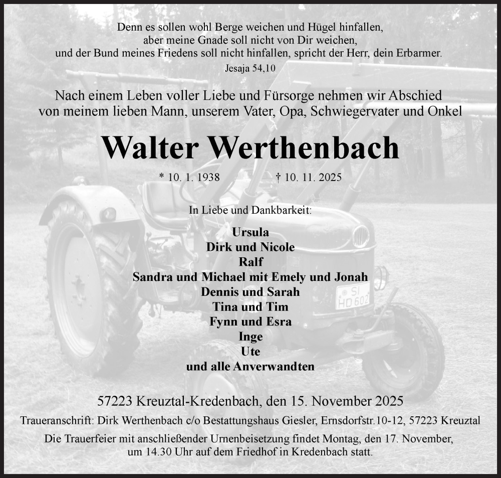 Hier finden Sie alle Traueranzeigen aus der Zeitung, die bisher für Walter Werthenbach erschienen sind. Weitere Traueranzeigen, die in der Zeitung erscheinen, werden hier ebenfalls aufgelistet