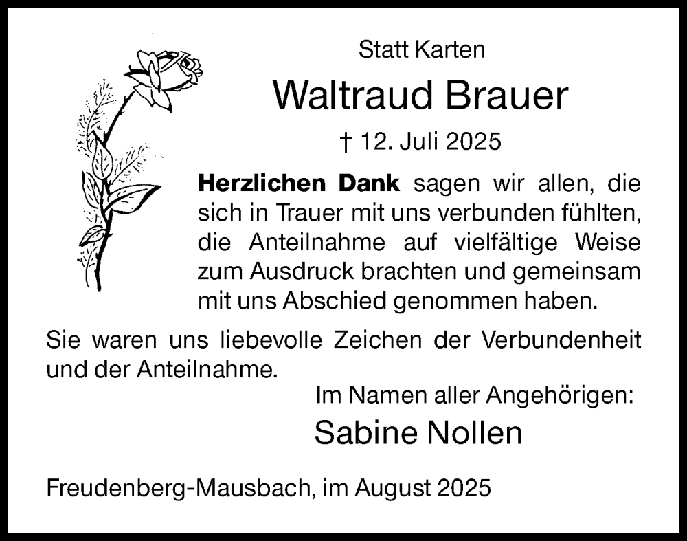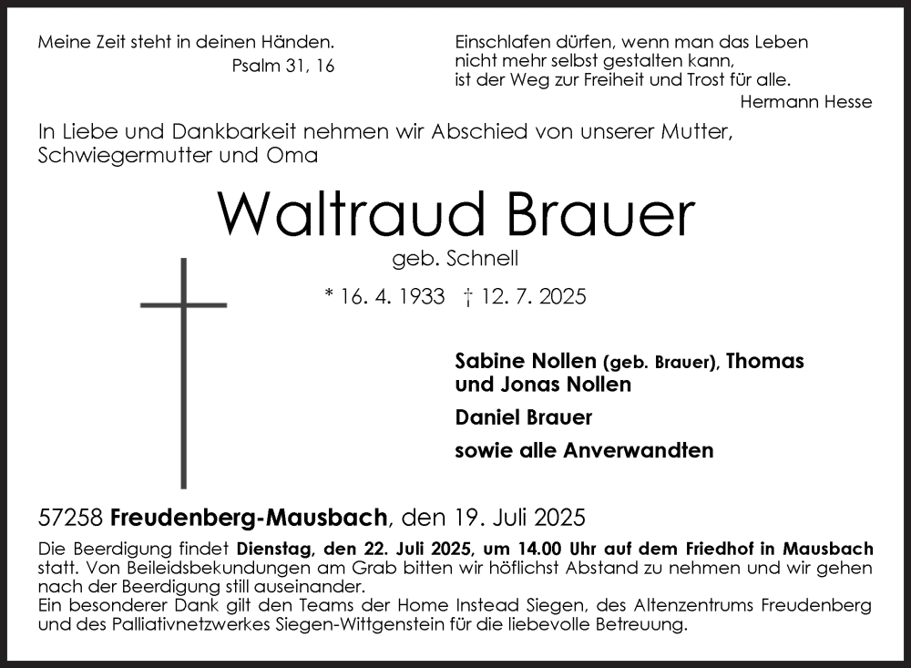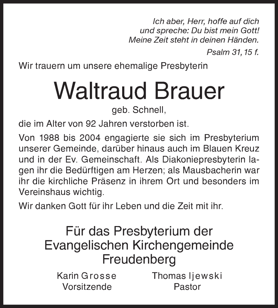Hier finden Sie alle Traueranzeigen aus der Zeitung, die bisher für Waltraud Brauer erschienen sind. Weitere Traueranzeigen, die in der Zeitung erscheinen, werden hier ebenfalls aufgelistet