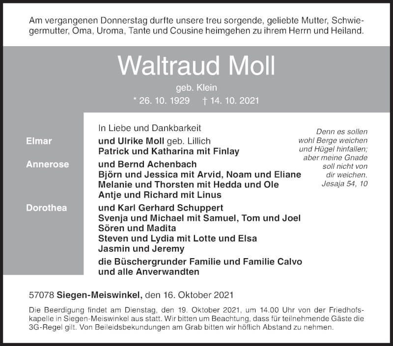 Hier finden Sie alle Traueranzeigen aus der Zeitung, die bisher für Waltraud Moll erschienen sind. Weitere Traueranzeigen, die in der Zeitung erscheinen, werden hier ebenfalls aufgelistet
