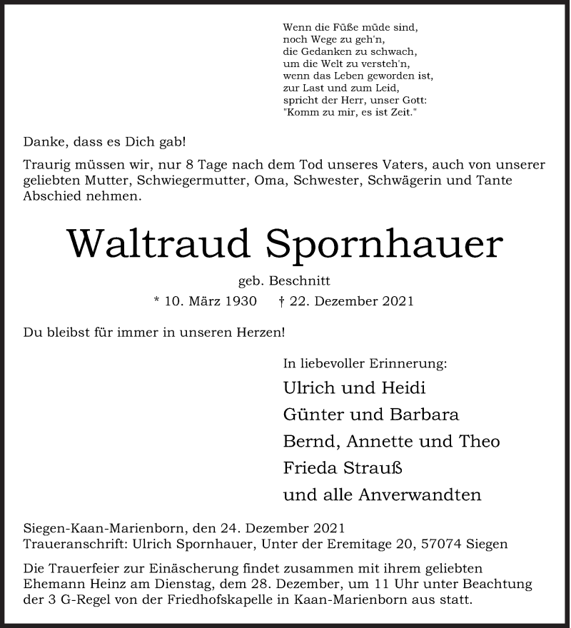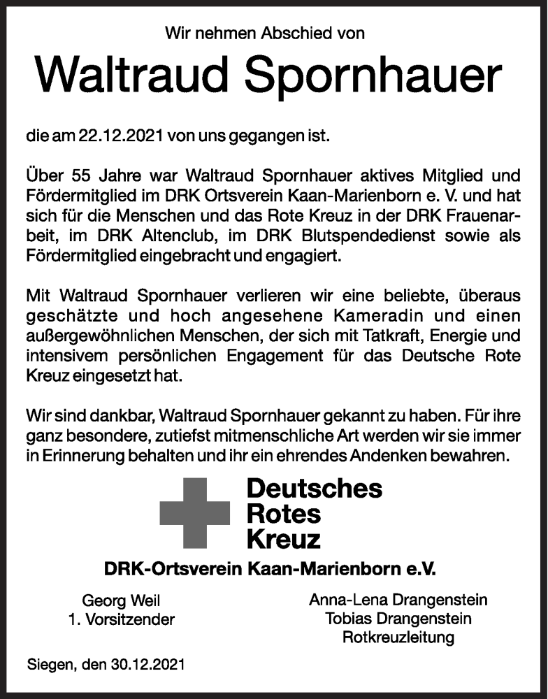Hier finden Sie alle Traueranzeigen aus der Zeitung, die bisher für Waltraud Spornhauer erschienen sind. Weitere Traueranzeigen, die in der Zeitung erscheinen, werden hier ebenfalls aufgelistet