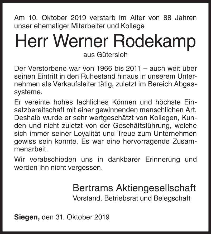 Hier finden Sie alle Traueranzeigen aus der Zeitung, die bisher für Werner Rodekamp erschienen sind. Weitere Traueranzeigen, die in der Zeitung erscheinen, werden hier ebenfalls aufgelistet