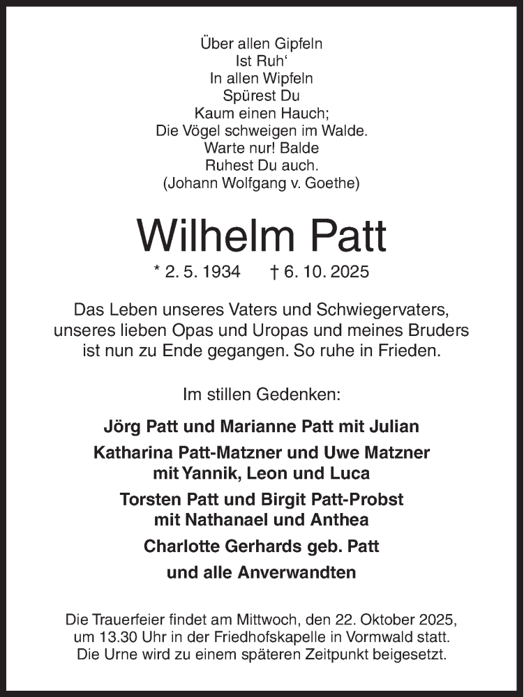 Hier finden Sie alle Traueranzeigen aus der Zeitung, die bisher für Wilhelm Patt erschienen sind. Weitere Traueranzeigen, die in der Zeitung erscheinen, werden hier ebenfalls aufgelistet
