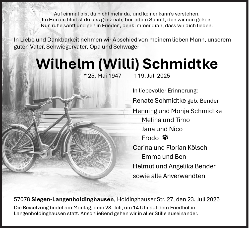 Hier finden Sie alle Traueranzeigen aus der Zeitung, die bisher für Wilhelm Schmidtke erschienen sind. Weitere Traueranzeigen, die in der Zeitung erscheinen, werden hier ebenfalls aufgelistet